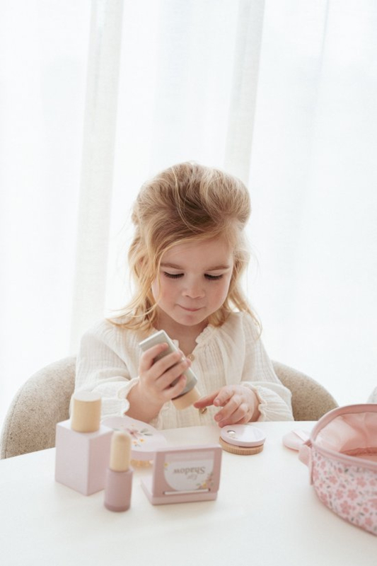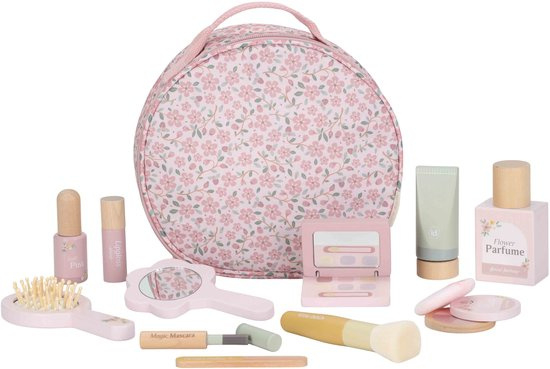 OverzichtNet als mama! Kinderen leren door te imiteren. Inspireer tot fantasierijk spelen met deze mooie beautycase. Het tasje heeft een kleurrijk bloemenpatroon en is gevuld met 10 houten speelgoedproducten. Zo is er een handspiegel, een parfumflesje en een tube crème. De set bestaat daarnaast uit lippenstift, nagellak, gezichtspoeder, poederdonsje, oogschaduw. mascara en een nagelvijl. De beautycase van Little Dutch zorgt voor speelplezier, zonder de rommel van echte make-up! Geschikt vanaf 3 jaar.